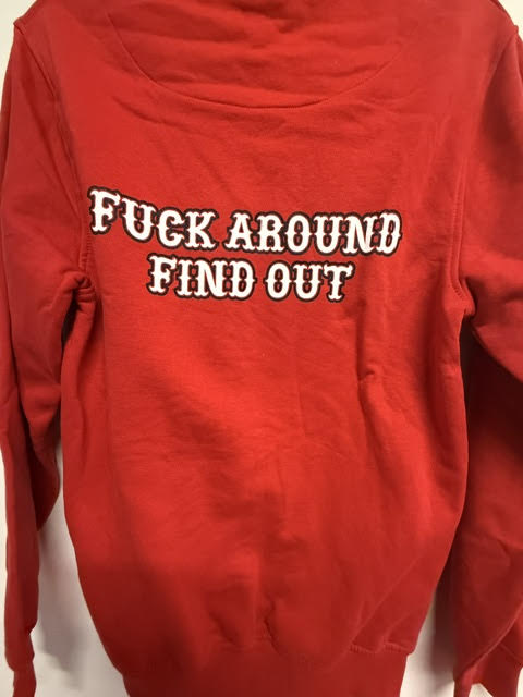 F around and find out on back of hoodie.